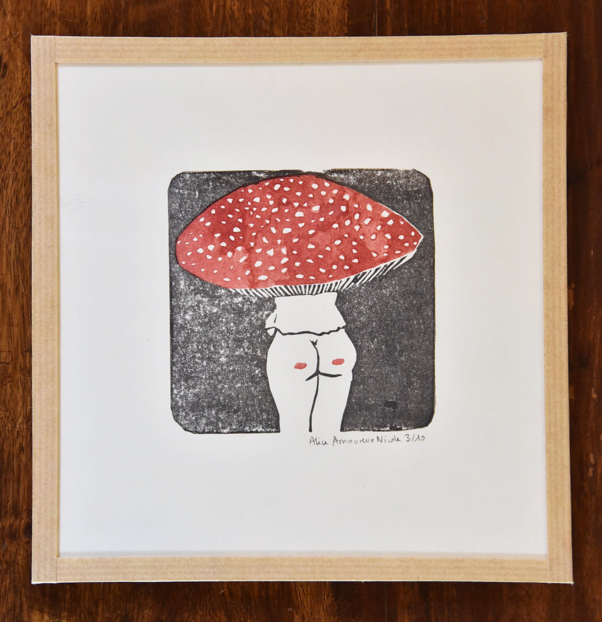 Linogravure superposée à une aquarelle originale créée par mes soins.