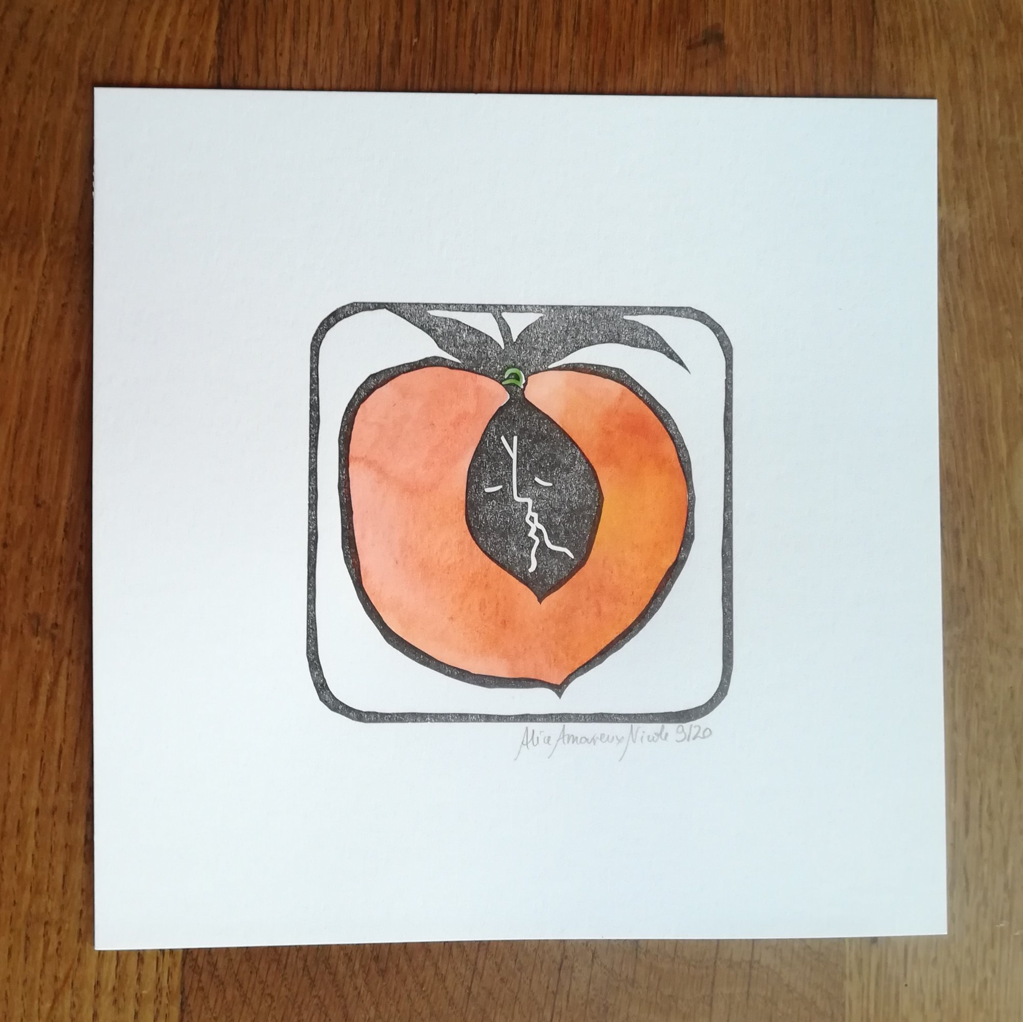 Linogravure superposée à une aquarelle originale créée par mes soins.