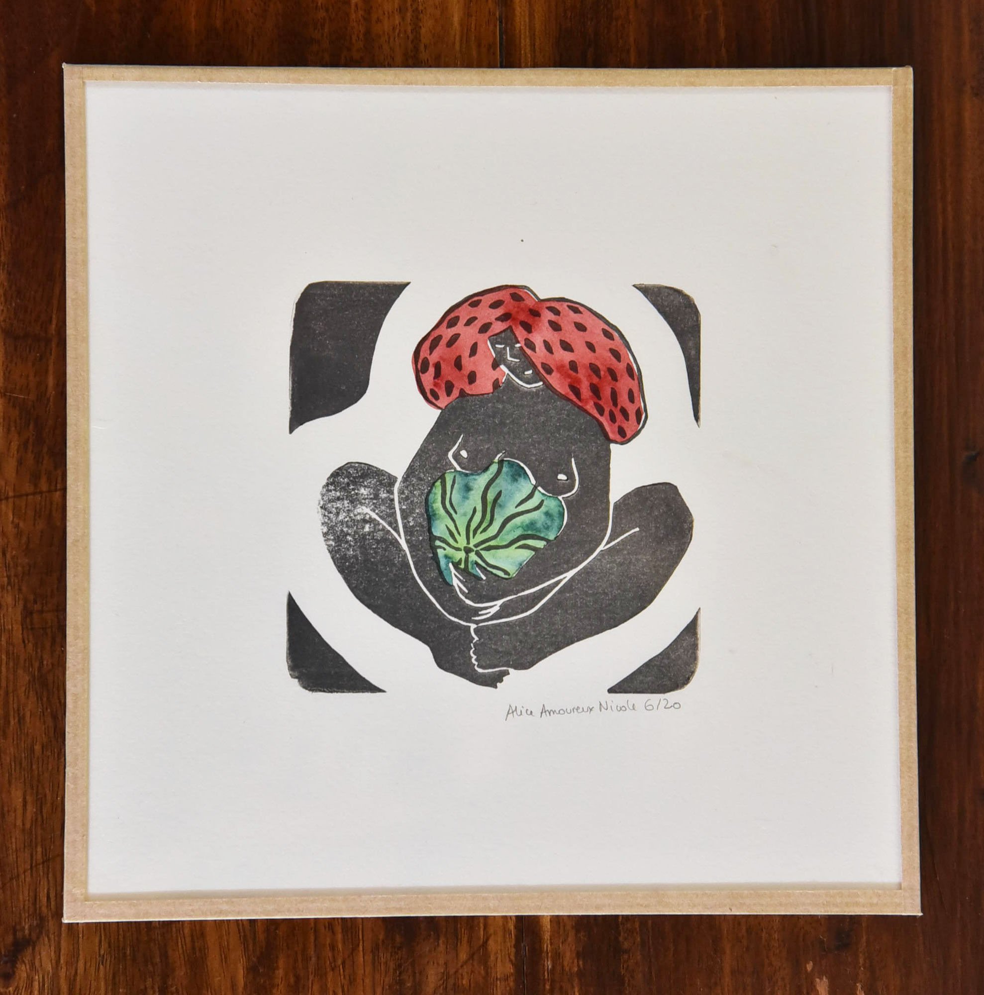 Linogravure superposée à une aquarelle originale créée par mes soins.